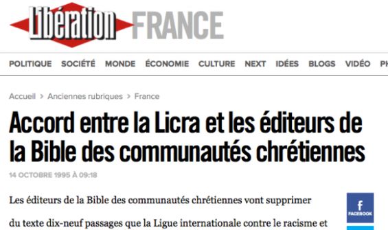 Depuis novembre 1995, en France, la Bible des communautés chrétiennes est donc amputée de dix-neuf passages considérés comme « l’expression d’un antijudaïsme » par la LICRA.